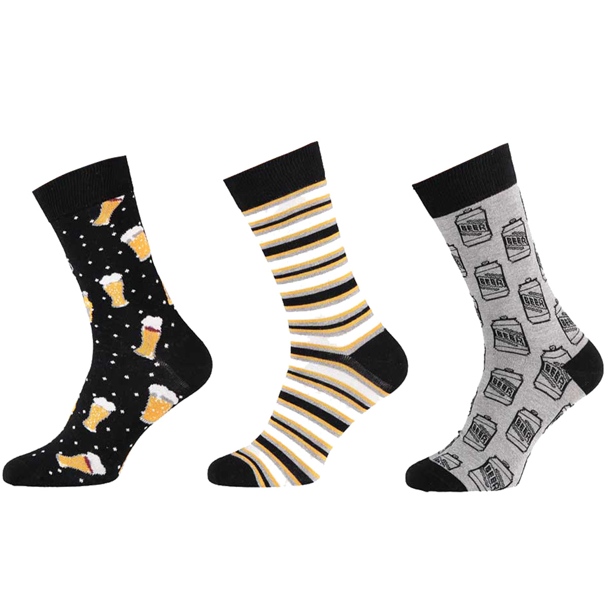 Modieuze heren sokken van katoen met bier printen en strepen, bundel van drie paar sokken.