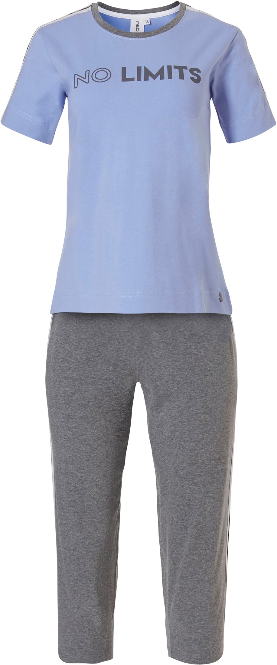 Dames pyjama van het merk Rebelle met korte mouw en 3/4 broek. Top 95% katoen en 5% elasthan. 3/4 broek 50% katoen, 45% polyester en 5% elasthan.