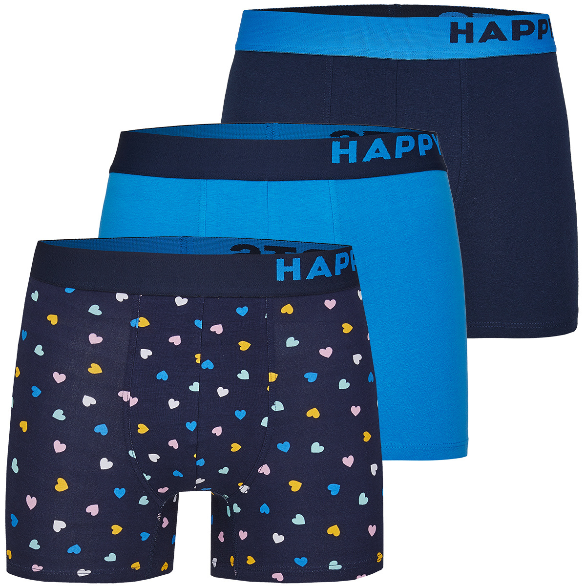 3 pack Trunks van het vrolijke merk Happy Shorts. Verpakking á 3 stuks, waarvan twee effen, één met gekleurde hartjes.