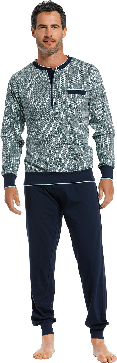 Heren pyjama van het merk Pastunette in een 100% katoenen single jersey kwaliteit. Top met lange mouw in een groen met blauwe kleur, ronde hals met 4 knoopjes en borstzakje. Uni lange broek in donker blauw. De pyjama is afgewerkt met elastische boorden voor een perfecte pasvorm.