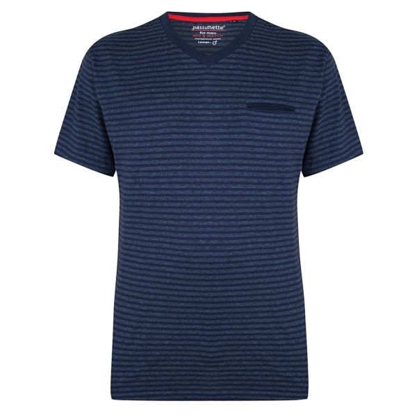 Heren shirt in een streep dessin met korte mouw en kleine V hals, te combineren met andere artikelen uit het Mix & Match programma of ook los te verkrijgen.