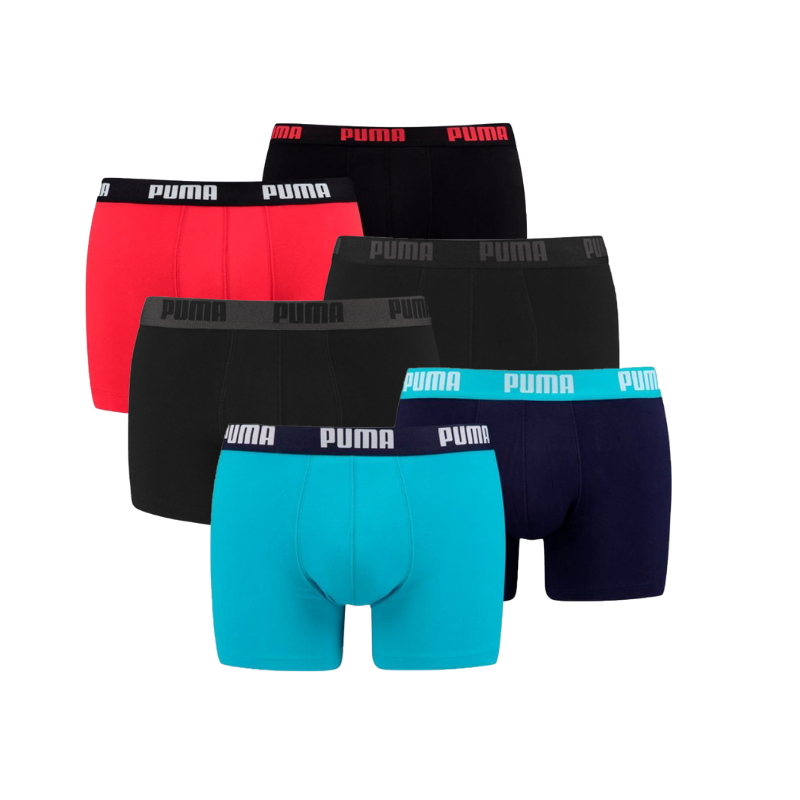 Puma 6-pack boxershorts. In dit voordeelpakket zitten 6 Puma boxershorts in de kleuren rood, blauw en zwart. In de elastische tailleband staat de merknaam geweven. De boxershorts zijn gemaakt van 95% katoen en 5% elastaan.