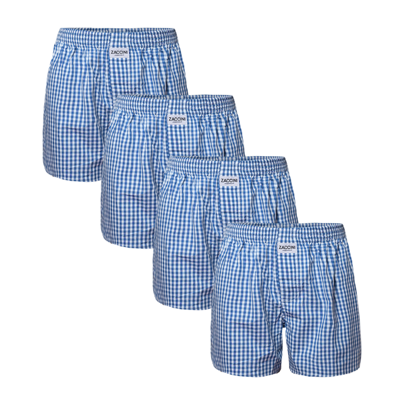 Zaccini 4-pack woven boxershorts. In de 4-pack zitten vier geruite wijden boxershorts van Zaccini. De boxershorts zijn uitgevoerd in de kleur lichtblauw. De boxershorts hebben een gulp met knoopje. Materiaal 100% katoen.