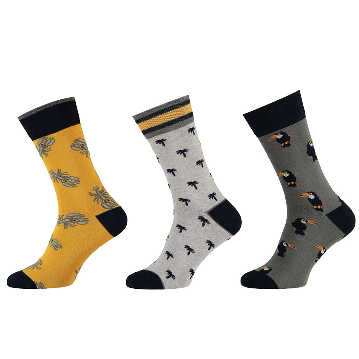 Modieuze heren sokken van katoen met drie verschillende printen, kleur geel/grijs.