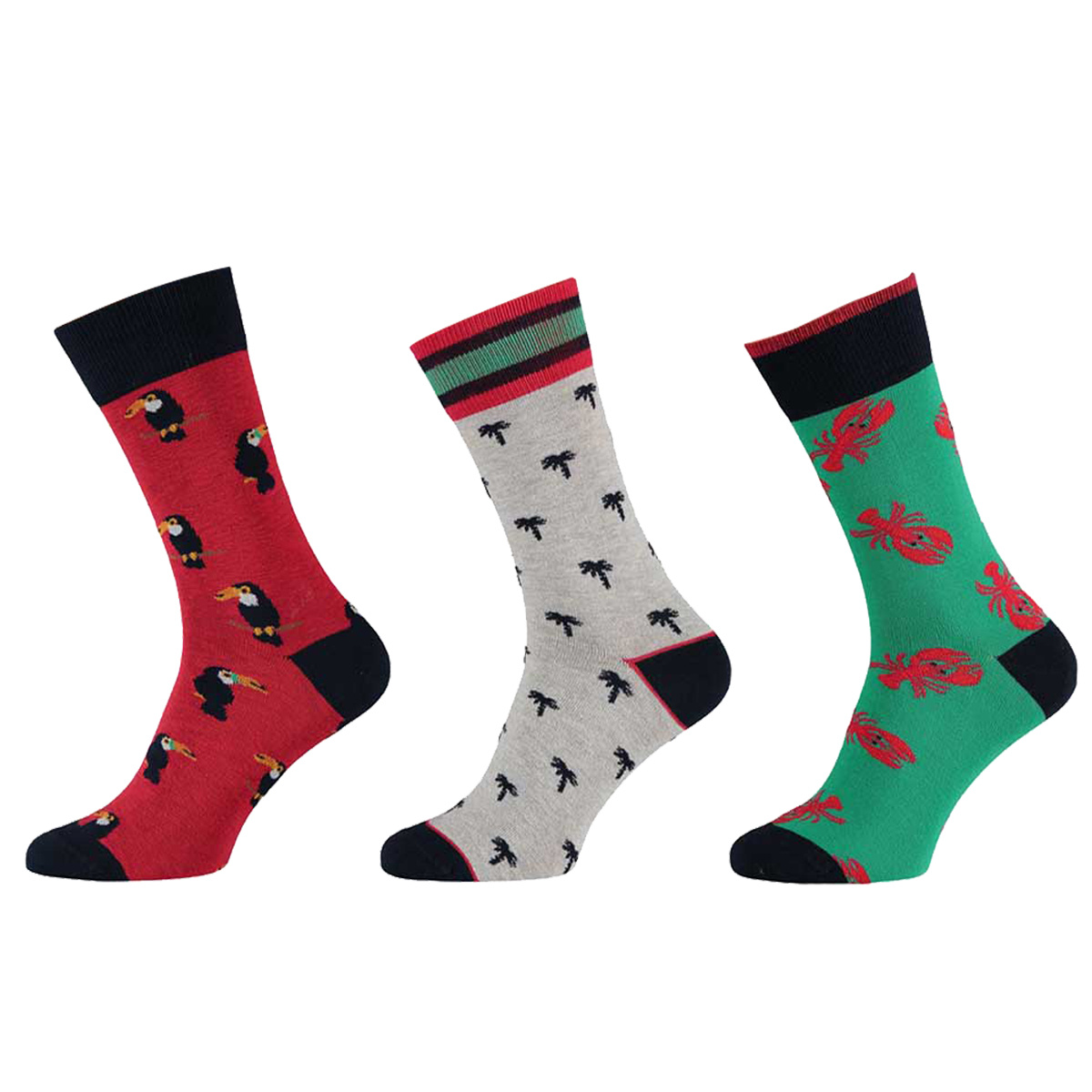Modieuze heren sokken van katoen met drie verschillende printen, kleur grijs/rood/groen. Zonder voelbare teennaad van 74% katoen, 23% polyamide en 3% elastaan.