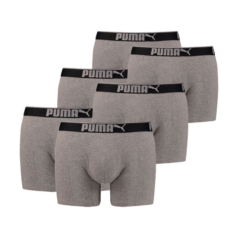 Puma 6-pack basic boxershorts. 6 basic grijze boxershorts van Puma. De boxershorts hebben allemaal een zwarte elastische tailleband voorzien van de naam Puma. De boxershorts van Puma voelen zacht aan en zitten comfortabel. Is grijs jouw favoriete kleur als het gaat om boxershorts? dan is deze voordelige 6-pack perfect voor jou.
