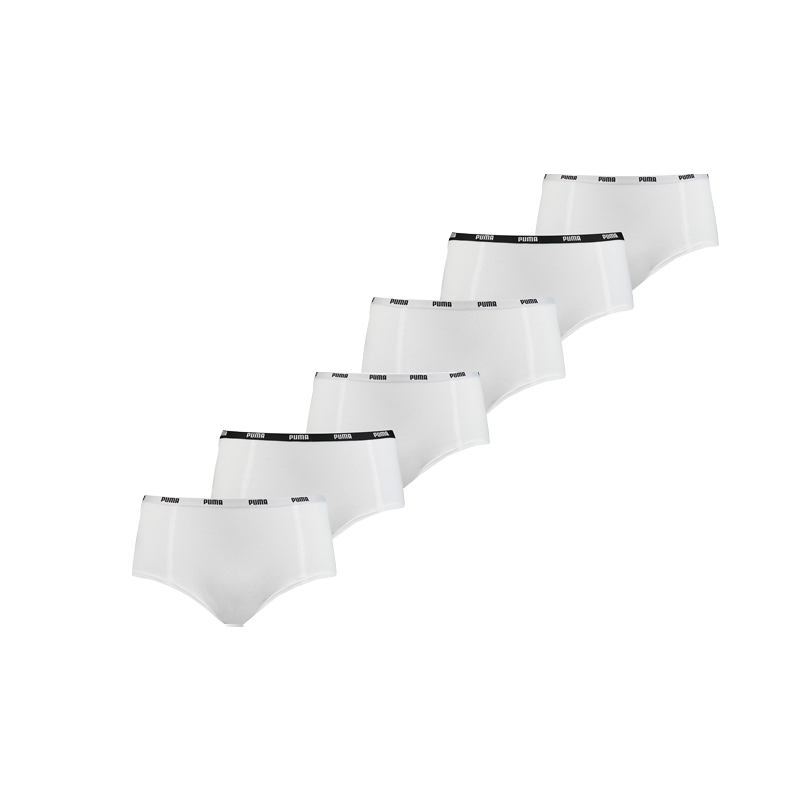 Puma 6-pack mini short. De witte dames shorts hebben korte pijpjes. In de elastische tailleband staat het Puma logo geweven. De stof bestaat uit 95% katoen en 5% elastaan.