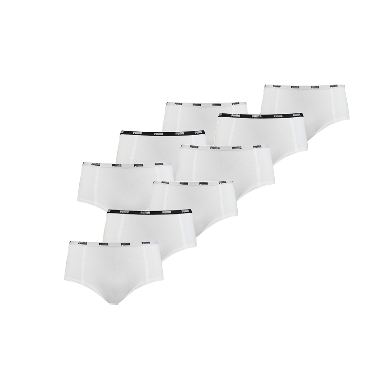 Puma 9-pack mini short. De witte dames slips hebben korte pijpjes. Het Puma logo staat in de elastische tailleband geweven. De stof bestaat uit 95% katoen en 5% elastaan.