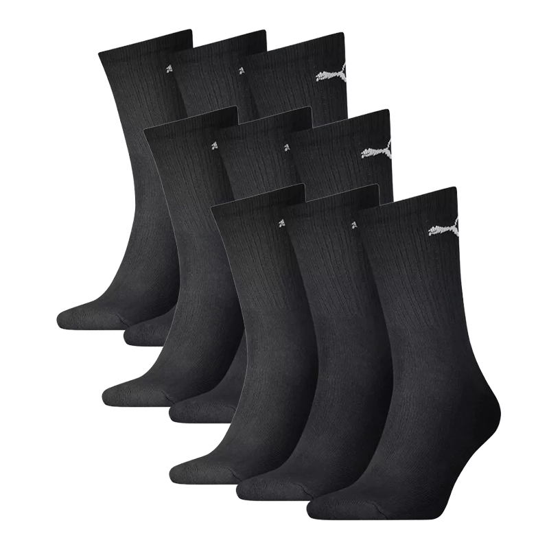 9 paar zwarte sportsokken van PUMA. Met deze pack ben je direct klaar voor de komende tijd. De vervaardiging van katoen en lycra maken deze sokken zweet doorlatend en optimaal draagcomfort. Sport ze.