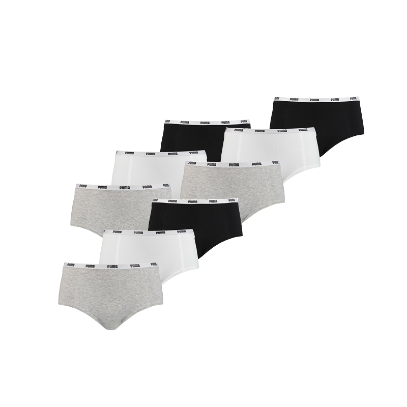 Puma mini short 9-pack. De dames slip hebben korte pijpjes. De shorts zijn in de kleuren grijs, zwart en wit. Het Puma logo staat in de elastische tailleband geweven. De slips bestaan uit 95% katoen en 5% elastaan.