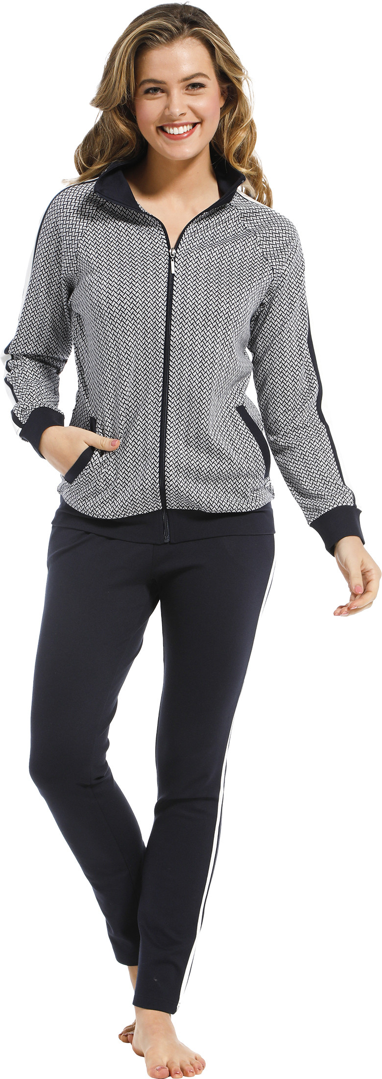 Dames huispak van de Pastunette De Luxe serie. Top met kraagje, rits en 2 steek zakken 58% polyester, 40% viscose en 2% elastan. Uni lange broek in donker blauw met aan de zijkant een contra bies.68% viscose, 28% nylon en 4% elastan.