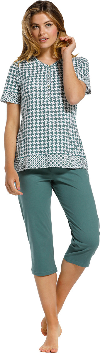 Dames pyjama met korte mouw, kleine V hals met 5 knoopjes en Uni 3/4 broek in het groen van het merk Pastunette.