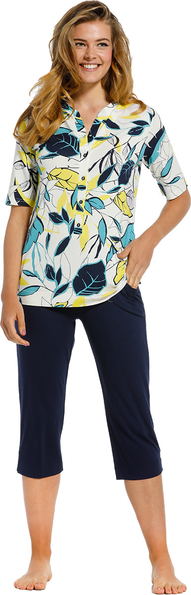 Dames pyjama met korte mouw en 3/4 broek van het merk Pastunette De Luxe in een mooie soepele 95% natuurlijke viscose kwaliteit met 5% elasthan. Top in leuk dessin met 5 knoopjes en korte mouw. Uni 3/4 broek in donker blauw.