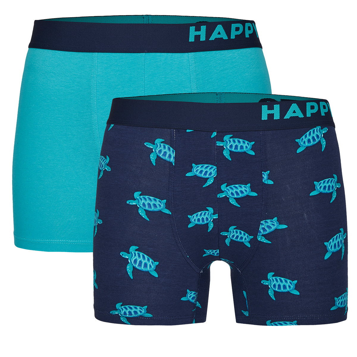 2 pack Trunks van het vrolijke merk Happy Shorts in het thema schildpadden. Verpakking Ñ 2 stuks, waarvan één effen lichtblauw, één donkerblauw met schildpadden.