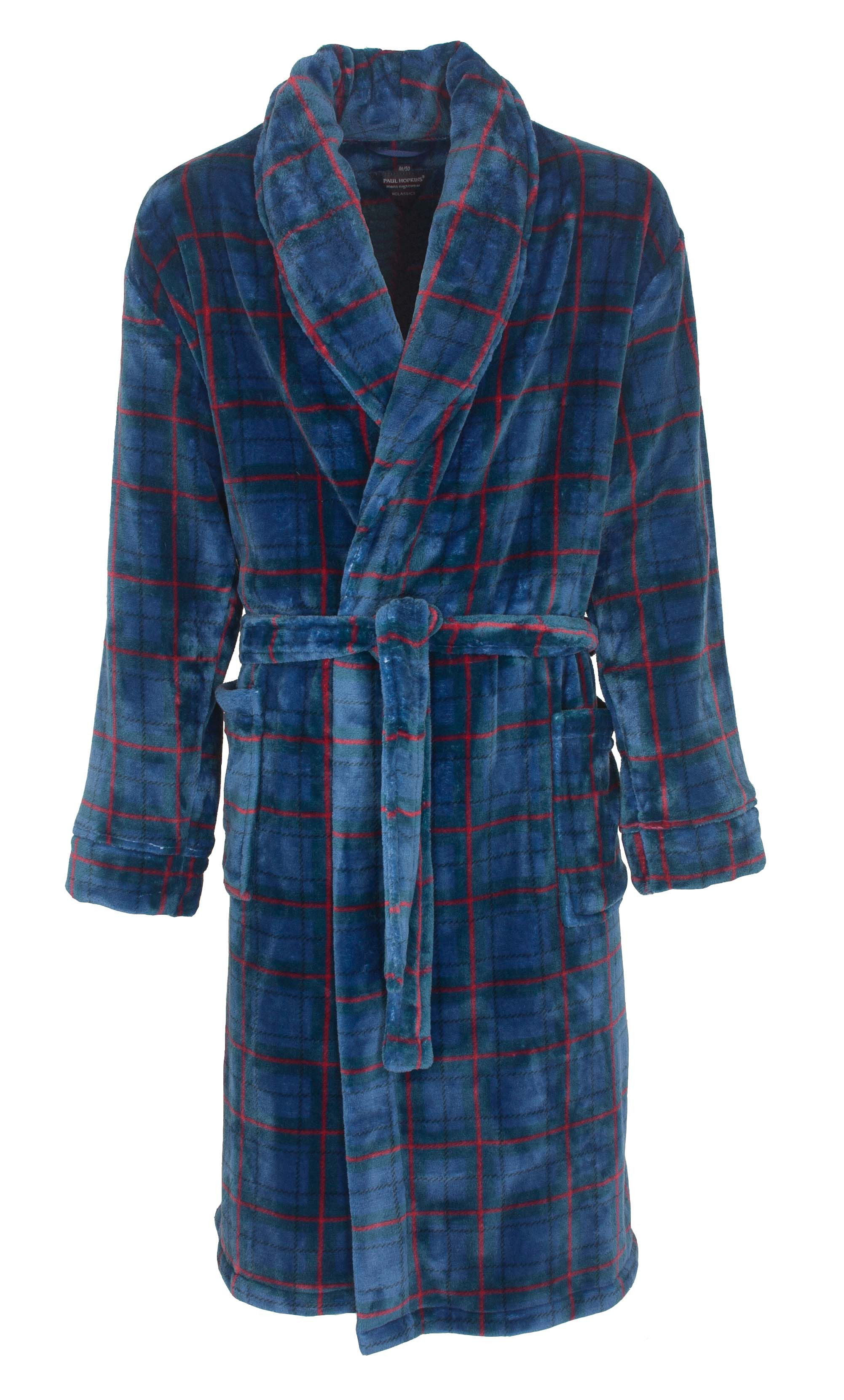 Heren badjas van een zachte Coral Fleece kwaliteit van 100% polyester. deze badjas is in een mooie meer kleurige blauw rode ruit. Brede sjaal kraag met 2 opgezette zakken en een ceintuur sluiting.