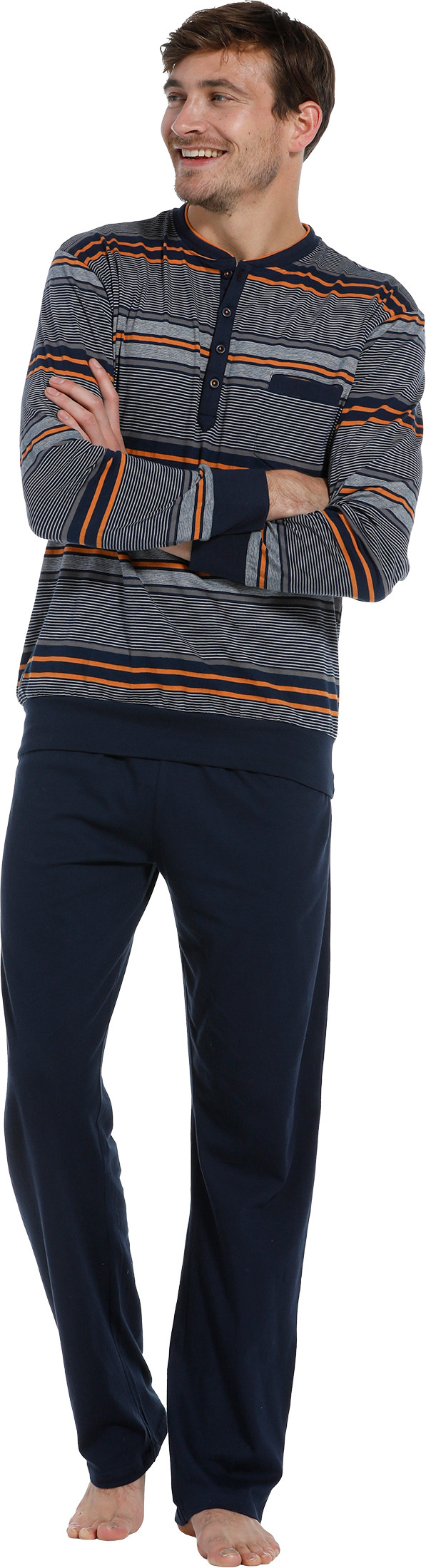 Heren pyjama van het merk Pastunette for men in een mooie 100% katoenen single jersey kwaliteit. Top in een streep dessin met ronde hals, 4 knoopjes en met borstzakje. Uni lange broek in donker blauw.