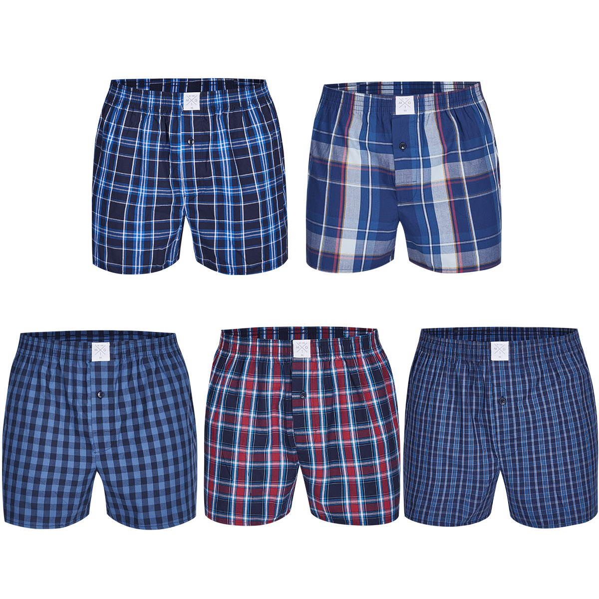 Voordeel multipack van 5 losse boxershorts voor heren van geweven katoen. Variatie van diverse blauw tinten in geblokt en geruit.
