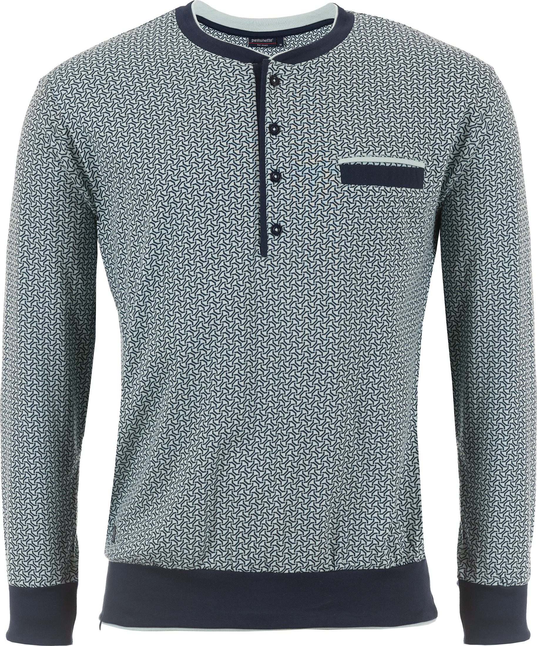 Heren pyjama / lounge shirt met lange mouw, ronde hals met mooie tricot boord en 4 knoopjes.