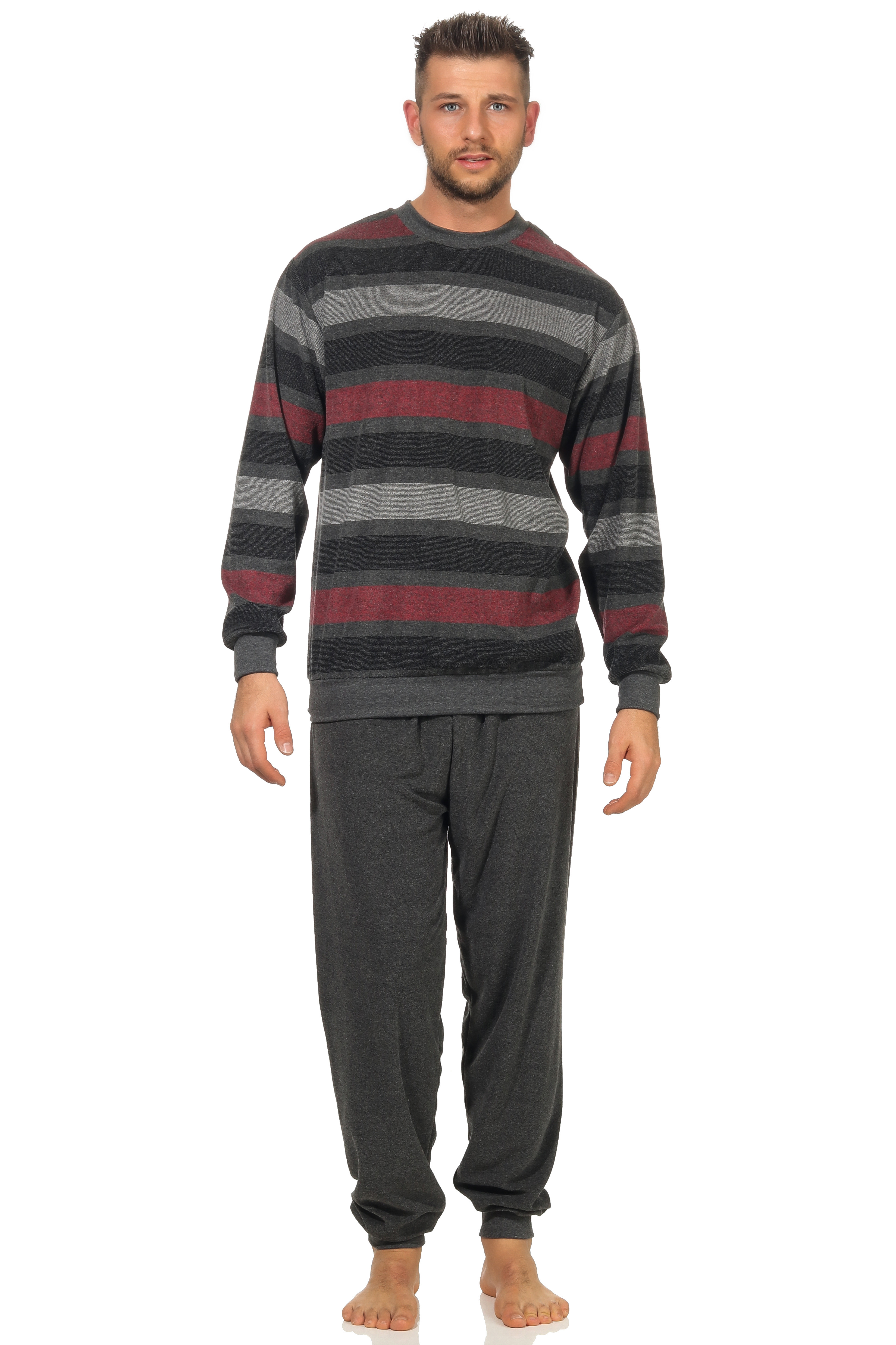 Badstof heren pyjama van het Duitse merk Normann. Mooie warme en zachte badstof kwaliteit, afgewerkt met elastische boorden voor een perfecte pasvorm. Top 51% polyester en 49% katoen. Broek 68% polyester en 32% katoen. Overwegend in grijze kleur met een gestreepte top. Top met rode streep is de kleur rood. Top met blauwe streep is de kleur blauw.