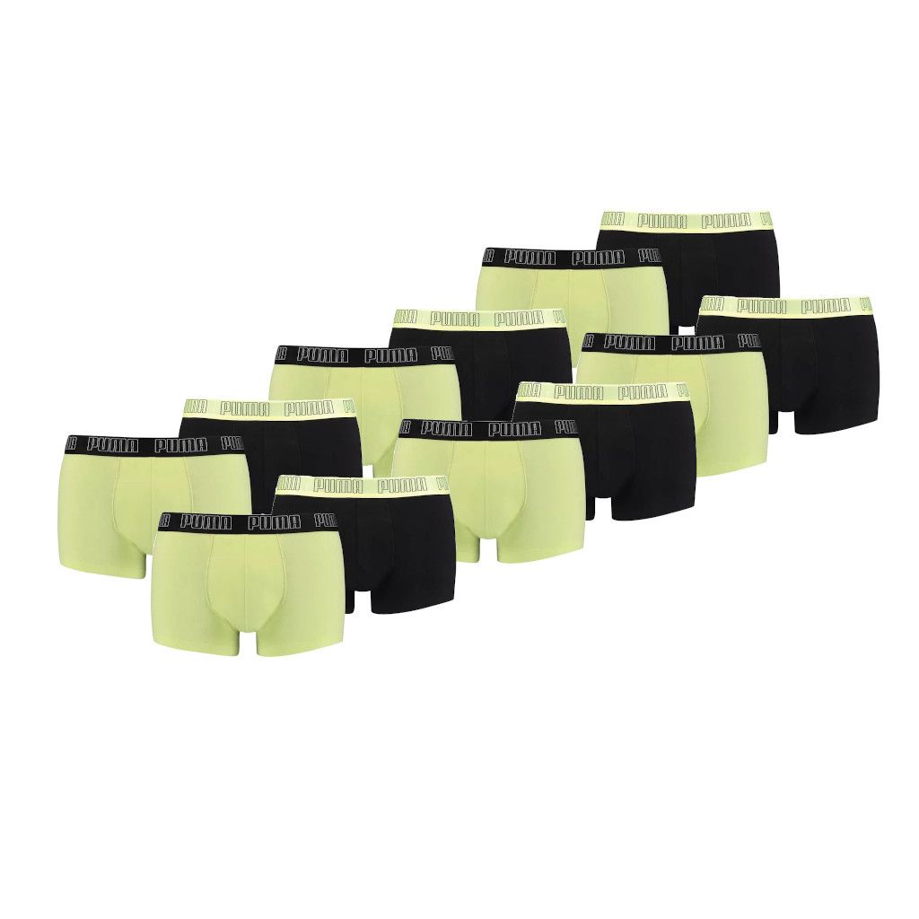 Puma 12-pack boxershorts basic trunk. Twaalf mooie basic boxershorts van Puma in het model trunk. De boxershorts zijn zwart met geel van kleur. In de elastische tailleband staat het merk "PUMA" geweven. De boxershorts zitten comfortabel en zijn gemaakt van goed materiaal. Materiaal: 95% katoen en 5% elastaan.