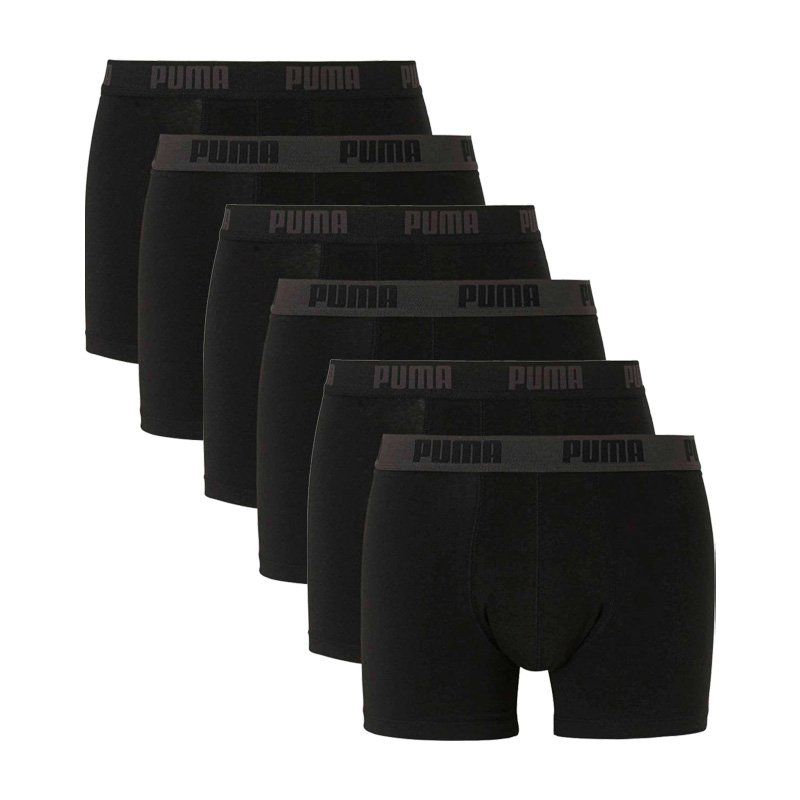 Puma 6-pack basic boxershorts. Set van 6 basic zwarte boxershorts van Puma. 3 boxers met een donkergrijze tailleband en 3 boxers met een zwarte tailleband. De elastische tailleband is bij elke boxershort voorzien van de naam Puma. De boxershorts van Puma hebben een comfortabele fit. Deze 6-pack is de perfecte basic set boxershorts voor elke man!