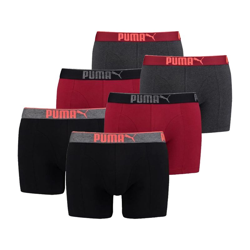 Puma 6-pack boxershorts. Set van zes effen boxershorts in het grijs, zwart en rood. Elke boxershorts komt twee keer voor in de set. De boxershorts hebben allemaal een elastische tailleband voorzien van de naam Puma. De boxershorts voelen zacht aan en zitten erg comfortabel.