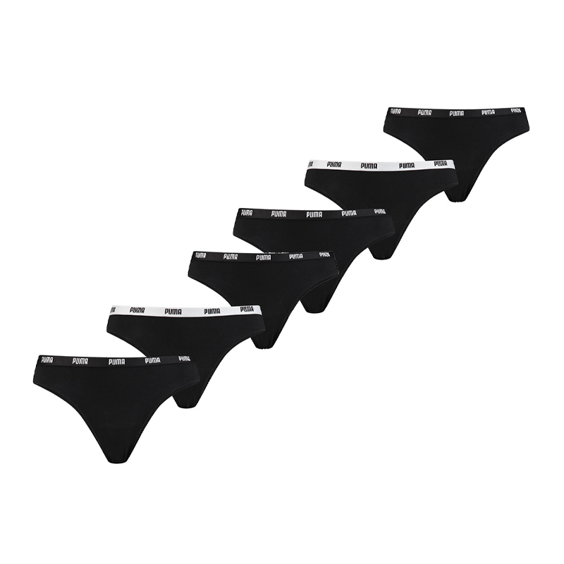 Puma 6-pack dames strings. De dames strings van Puma zijn zwart van kleur. De elastische tailleband is in het wit en in het zwart uitgevoerd. Het puma logo staat in de band geweven. Een leuke aanvulling op je ondergoed.
