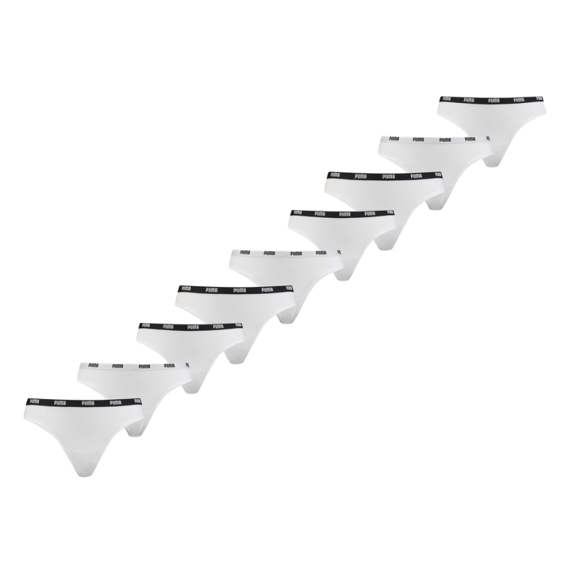 Puma 9-pack dames strings. In dit voordeelpakket zitten negen dames strings in de kleur wit. In de elasitsche tailleband staat het merk "Puma" geweven. De strings zijn gemaakt van extra fijn materiaal. Materiaal: 95% katoen en 5% extra. Een duurzame aanvulling voor je kledingkast!