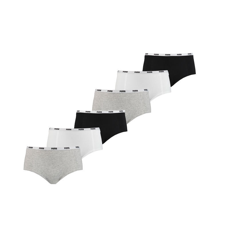 Puma mini short 6-pack. De dames slip hebben korte pijpjes. De shorts zijn in de kleuren grijs, zwart en wit. Het Puma logo staat in de elastische tailleband geweven. De slips bestaan uit 95% katoen en 5% elastaan.