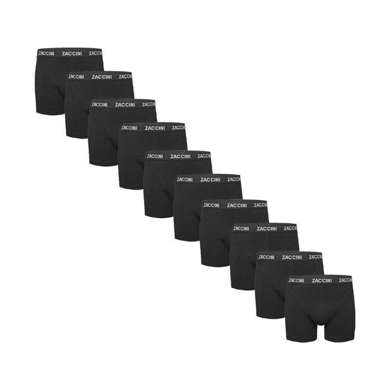 Zaccini 10- Pack Boxershorts zwart. Deze 10-pack Zaccini boxershorts zijn uitgevoerd met een perfect bijpassende tailleband met merklogo Zaccini. Deze speciale deal is super voordelig en jouw kans om deze solide basis shorts van Zaccini te bemachtigen voor een super prijs! Zaccini boxershort zijn gemaakt van een hoge kwaliteit katoen, met elastaan wat zorgt voor een nauwsluitende pasvorm voor perfect draagcomfort. Materiaal 95% katoen en 5% elastaan.