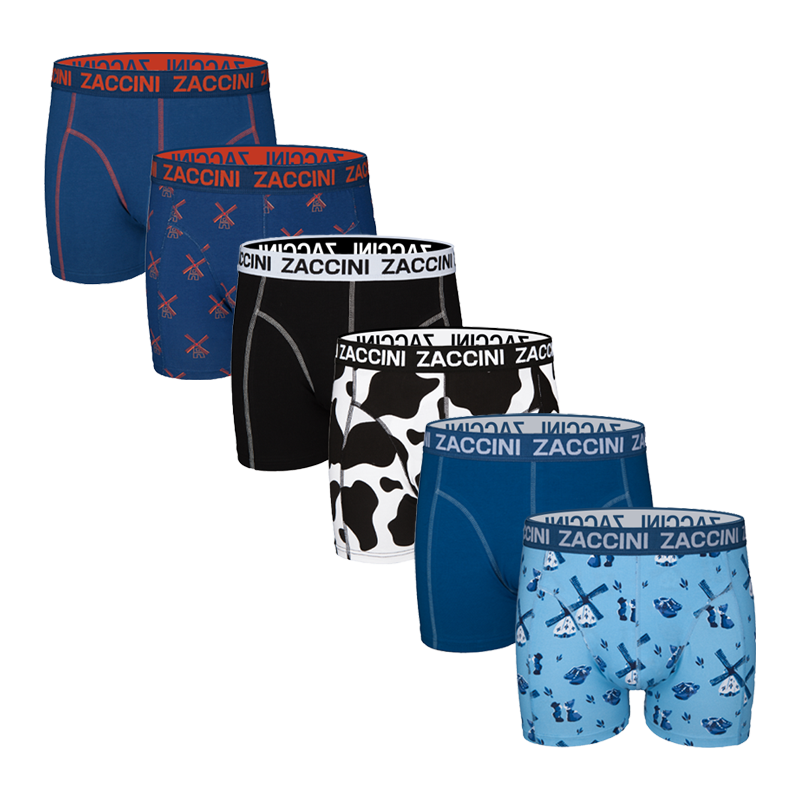 Zaccini 6 boxershorts Dutch pack. Ben jij gek op de koeien in de wei, delfts blauw, trots op de molens of vind je het gewoon leuke prints? Dan is dit pakket echt iets voor jouw! In dit pakket zitten 3 boxershorts met print en 3 effen.