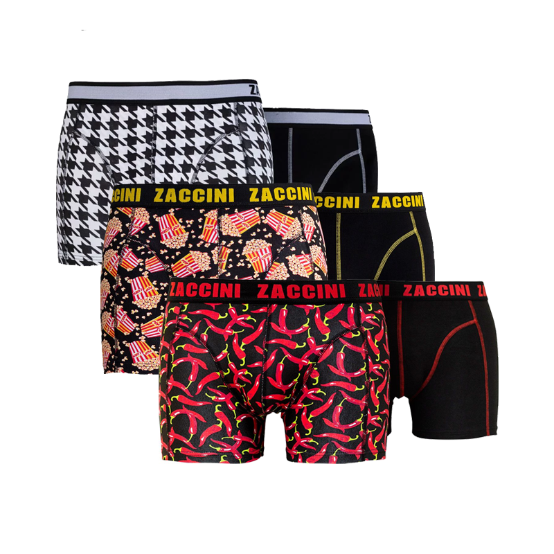Zaccini 6-pack boxershorts. Deze geweldige 6-pack is perfect voor mannen die niet bang zijn om een opvallende boxershort te dragen. De set bestaat uit drie boxers met een te gek printje en 3 effen boxershort. Ook deze drie basics heeft elke man nodig natuurlijk. De boxershorts van Zaccini zitten comfortabele en voelen zacht aan. De boxershorts hebben allemaal een elastische tailleband voorzien van de merknaam Zaccini. Ben jij klaar voor deze opvallende boxers?