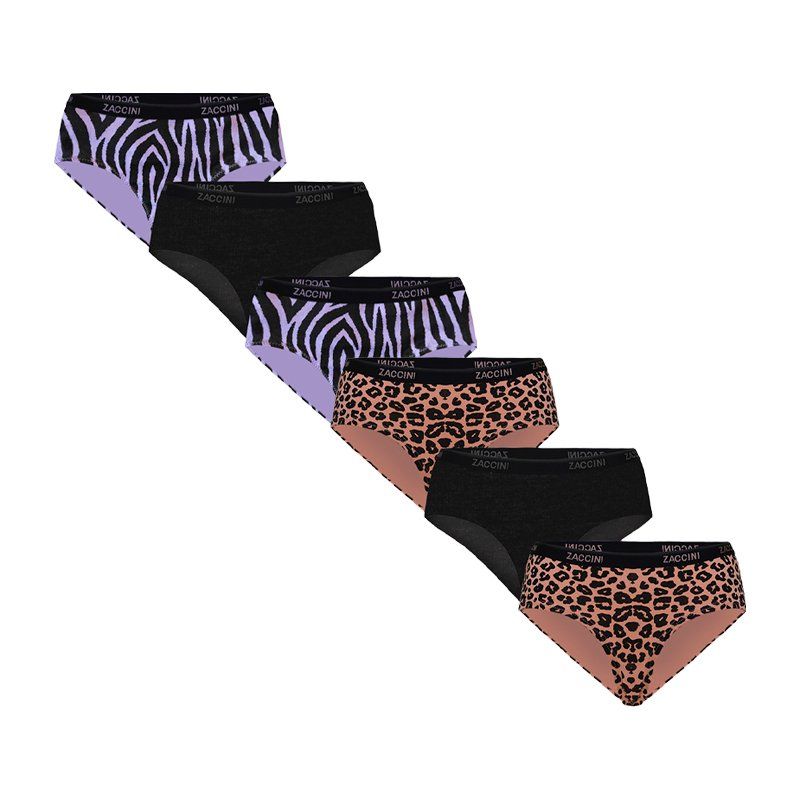 Zaccini 6-pack hipsters mix. Een mooie mix van leopard en lila. Materiaal: 95% katoen en 5% elastaan.