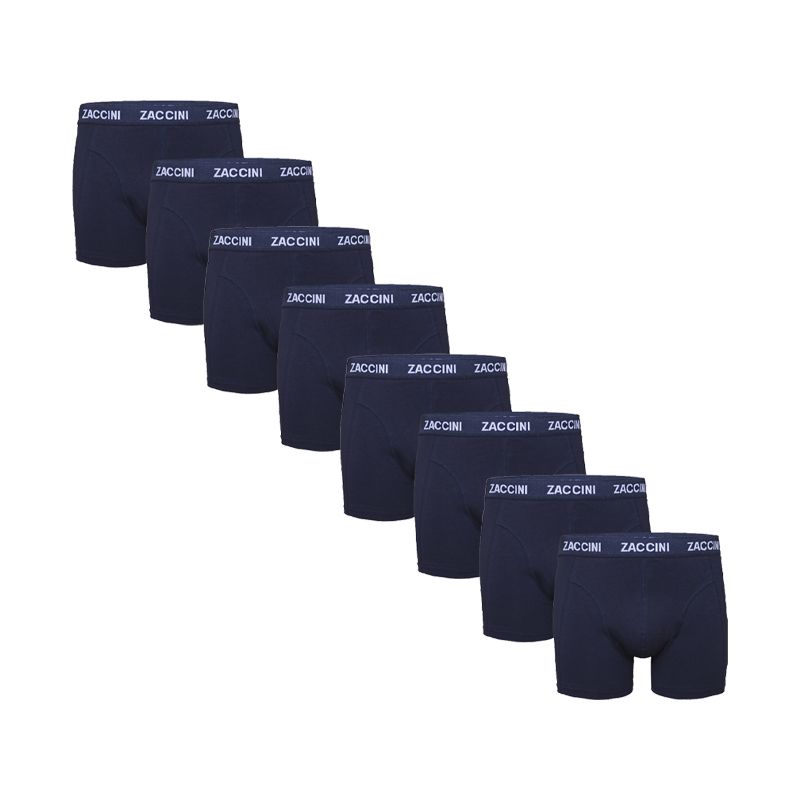 Zaccini 8-pack boxershorts. Vul je kast met maar liefst acht boxershorts van Zaccini. In deze pack zitten acht uni's in de kleur navy. De boxers zijn van topkwaliteit en zitten super comfortabel. In de elastische tailleband staat de merknaam geweven. Materiaal: 95% katoen en 5% elastaan. Een mooi voordeelpakket voor een mooi prijsje.