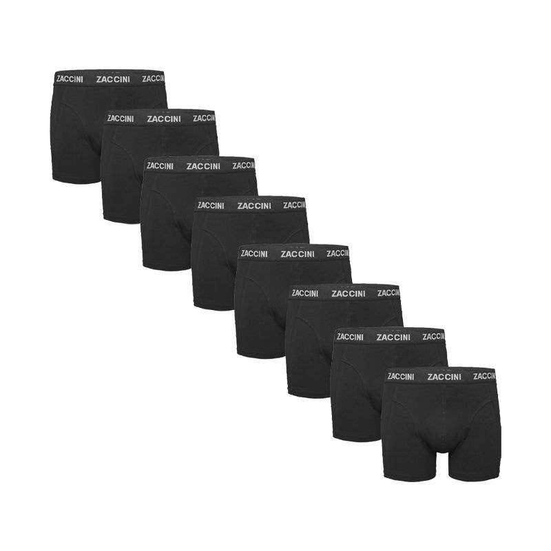 Zaccini 8-pack boxershorts. Vul je kast met maar liefst acht boxershorts van Zaccini. In deze pack zitten acht uni's in de kleur zwart. De boxers zijn van topkwaliteit en zitten super comfortabel. In de elastische tailleband staat de merknaam geweven. Materiaal: 95% katoen en 5% elastaan. Een mooi voordeelpakket voor een mooi prijsje.